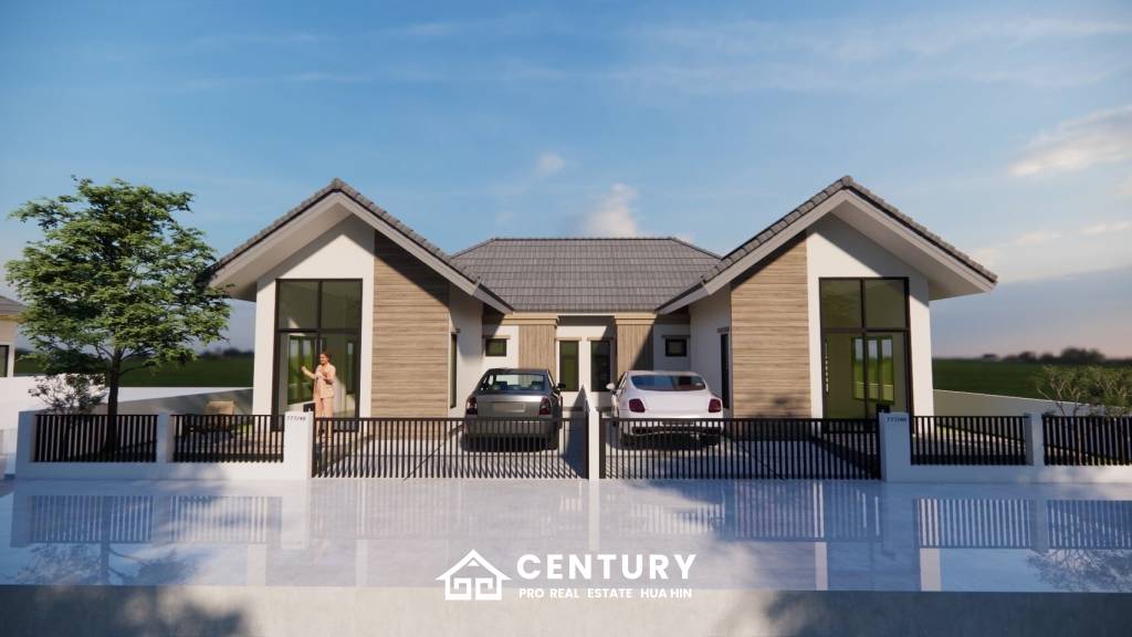 The 9 Khao Tao Phase 2 offers modern detached duplex homes located in the serene Wang Phong area of Pran Buri, Prachuap Khiri Khan. This exclusive development features contemporary architectural design with sloping roofs, large front windows, and a pristine white exterior, ensuring a bright and airy living environment.