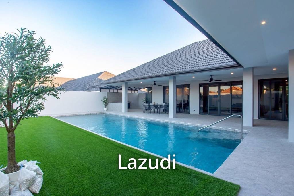 This luxury 4 bed pool villa is now 95% complete in October 2025 and will be completed by end of October 2025. The villa features a large and spacious open plan living, dining and modern European kitchen with feature island, master bedroom with walk-in wardrobe and spacious bathroom, 3 more bedrooms with en-suite bathrooms and fitted wardrobes and a separate guest bathroom. Outside is a large covered terrace, big pool and lawn garden, covered double carport with storage and laundry room and an outside thai BBQ kitchen. The location is in the southern end of Hua Hin town and close to Blu Port and the beach
